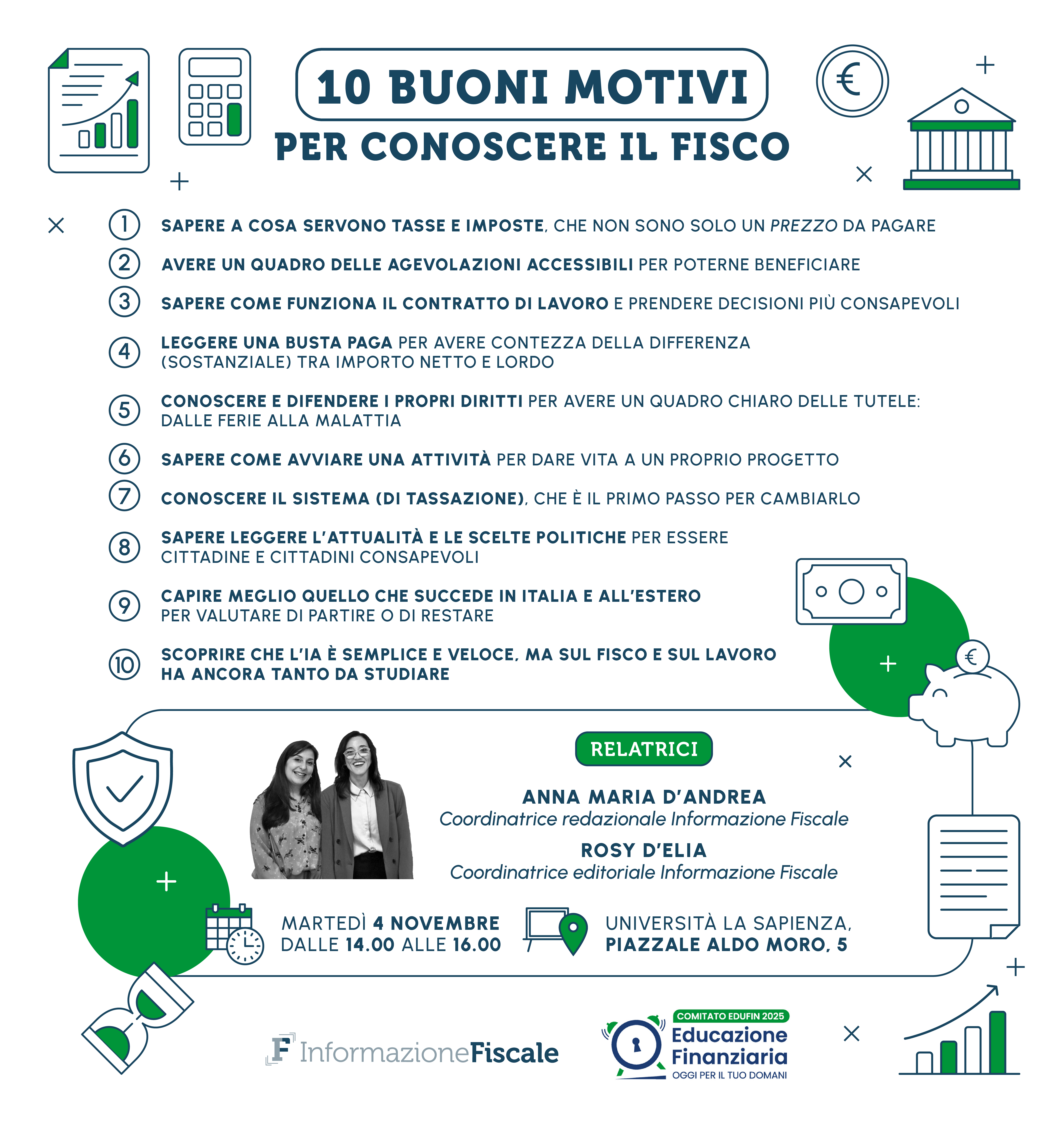 La conoscenza ha un valore inestimabile, anche in termini economici: da questo presupposto nasce l’evento formativo organizzato dalla redazione di Informazione fiscale nell’ambito dell’iniziativa “Educazione finanziaria: oggi per il tuo domani” promossa dal Comitato per la programmazione e il coordinamento delle attività di educazione finanziaria per il mese di novembre 2025. L’iniziativa è dedicata a studenti e studentesse della scuola secondaria di secondo grado e dell’Università ed è finalizzato a favorire la conoscenza di concetti di base del Fisco e del Lavoro, ma anche a offrire gli strumenti per analizzare le sfide e le opportunità più rilevanti per chi si prepara ad avviare la sua carriera lavorativa.