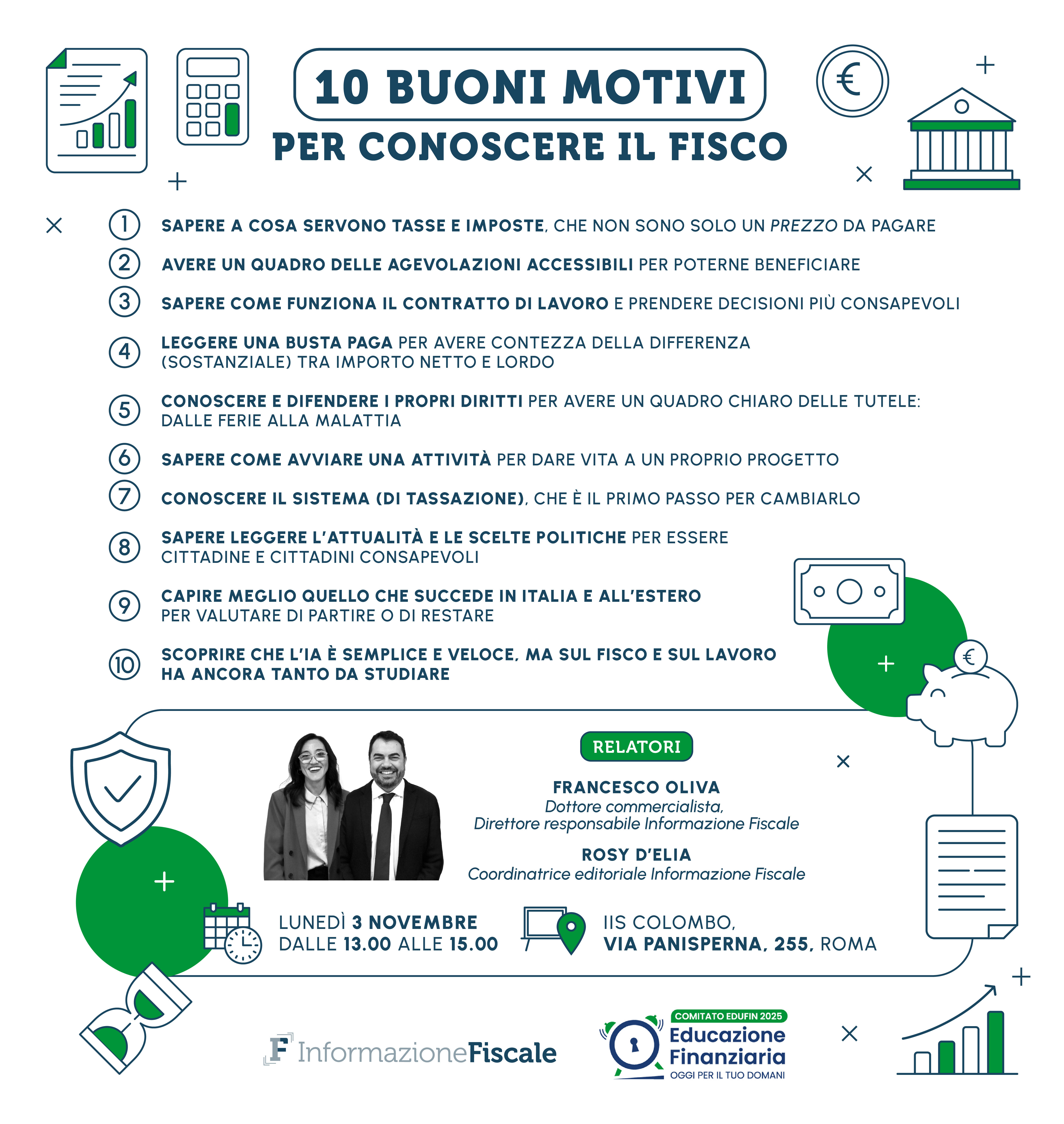 La conoscenza ha un valore inestimabile, anche in termini economici: da questo presupposto nasce l’evento formativo organizzato dalla redazione di Informazione fiscale nell’ambito dell’iniziativa “Educazione finanziaria: oggi per il tuo domani” promossa dal Comitato per la programmazione e il coordinamento delle attività di educazione finanziaria per il mese di novembre 2025. L’iniziativa è dedicata a studenti e studentesse della scuola secondaria di secondo grado e dell’Università ed è finalizzato a favorire la conoscenza di concetti di base del Fisco e del Lavoro, ma anche a offrire gli strumenti per analizzare le sfide e le opportunità più rilevanti per chi si prepara ad avviare la sua carriera lavorativa.